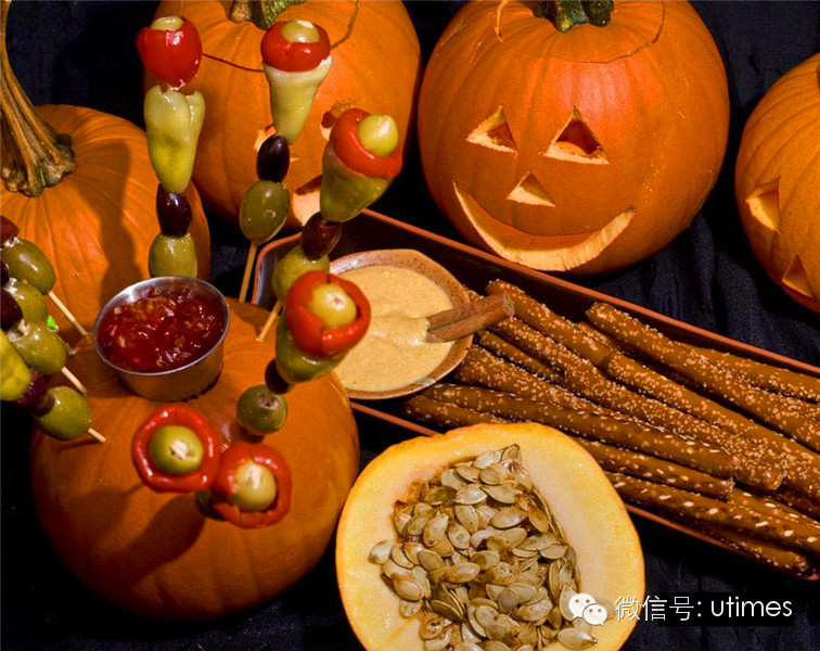 万圣节有几样吃的东西是必备的:南瓜派、苹果、糖果,有的地方还会准备各种特色甜点食品,养眼吧!